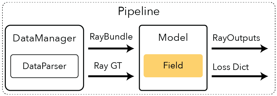 A Field is a model component that associates a region of space with some sort of quantity. In the most typical case, the input to a field is a 3D location and viewing direction, and the output is density and color. Let’s take a look at the code.